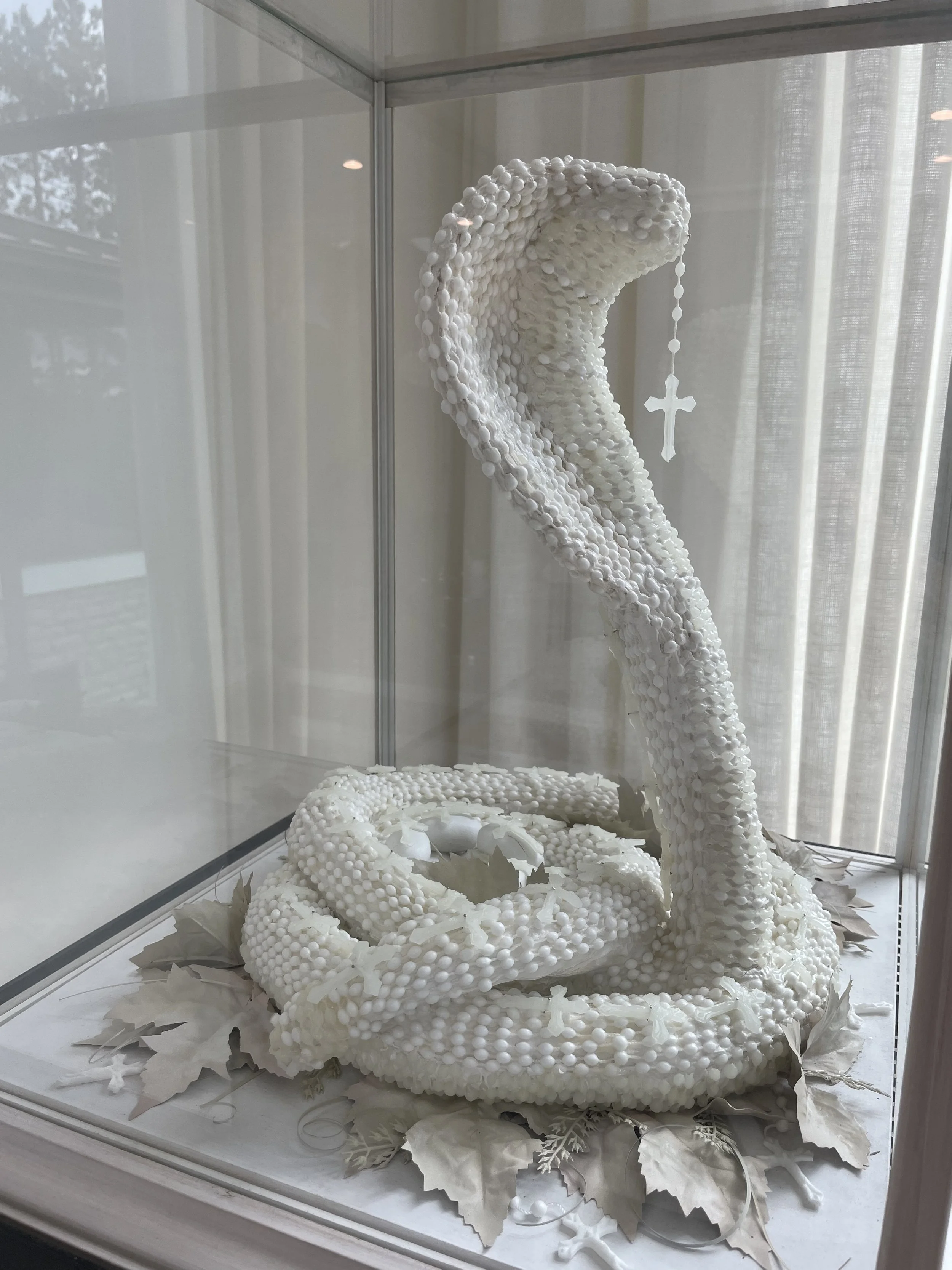 COBRA 𓆦White and glowing rosaries, wire, cloth, paper, clay, plastic, custom made wood case and steal stand.Began 2013-completed 2015⊙
