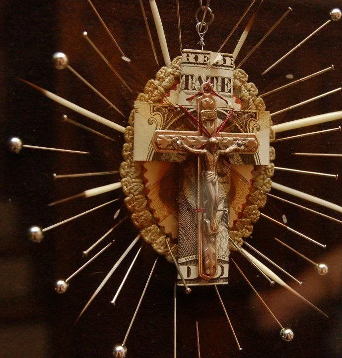 In God We Trust 𓆦Five decades of American currency, handmade silver links, bug pins, crucifix, porcupine quill, red string, purple velvet, encased in frame, behind glass.Began 2007-revised 2016⊙