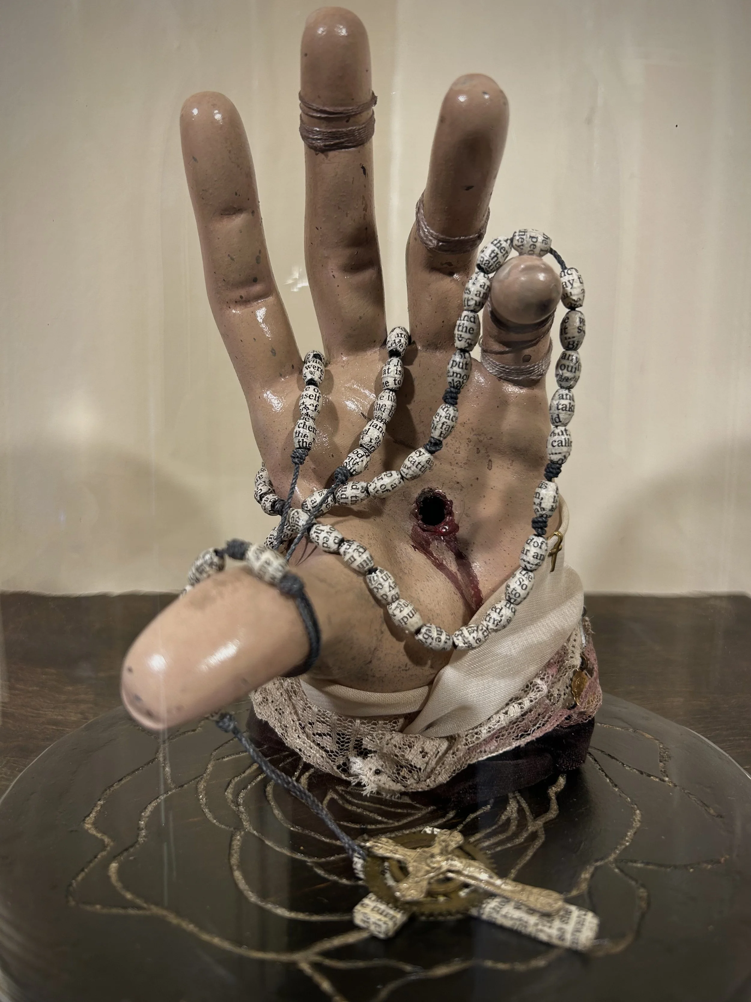 Hard rubber left hands from Mannequin, velvet, lace, prayer medals, crushed opossum bones inlaid in hand-carved rose in base, acrylic paint, rosaries covered in the book of Genesis, clock gears, wax, glass domes on modified base.