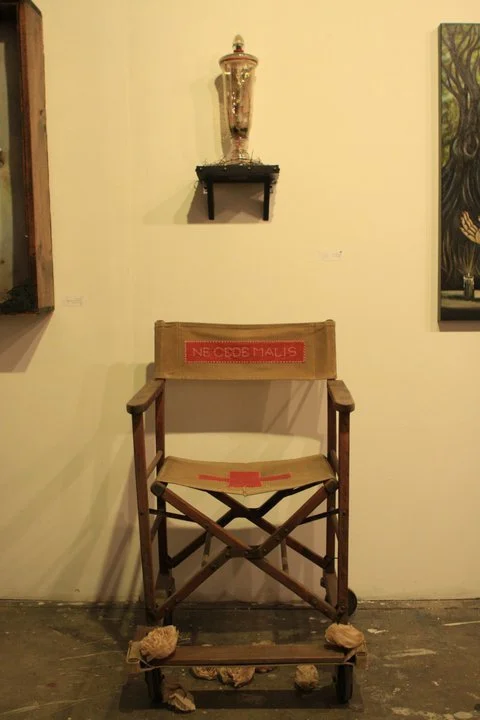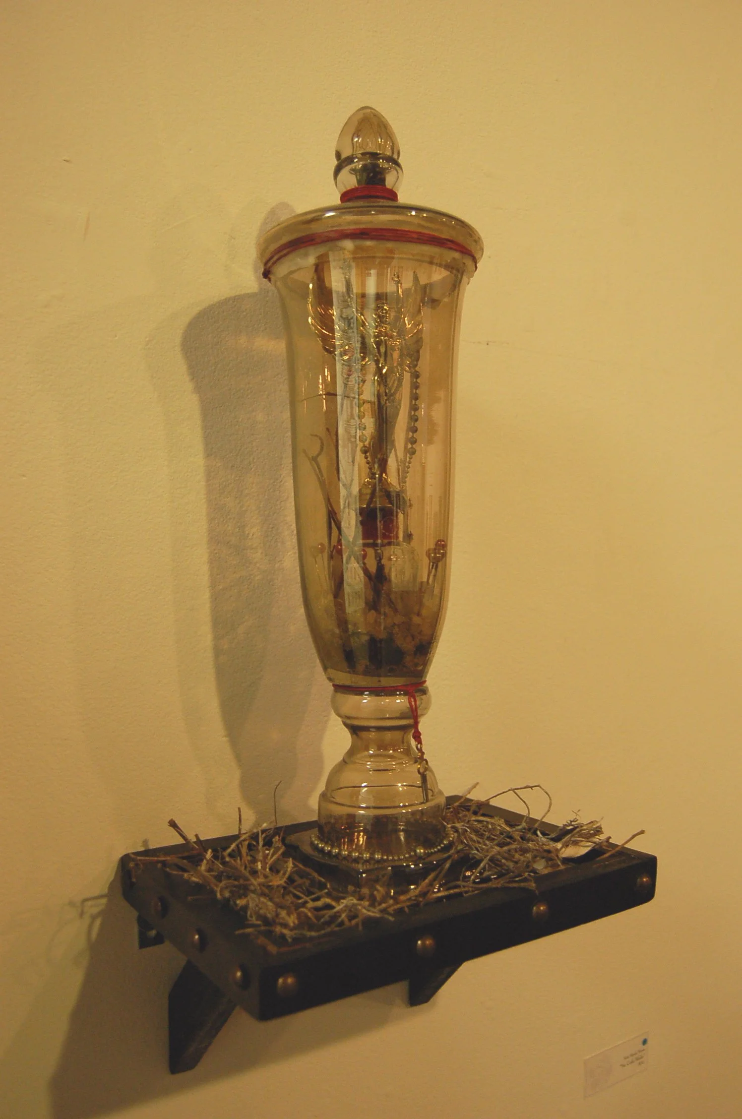 WWI wheelchair, hand stitched phrase and Red Cross, glass urn assemblage.