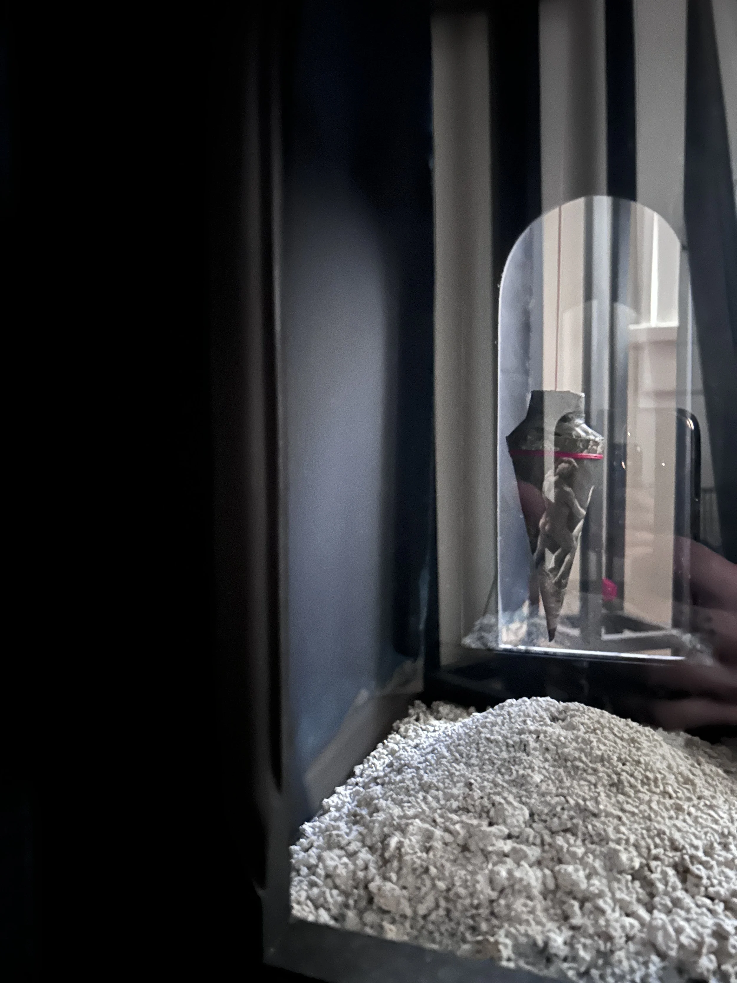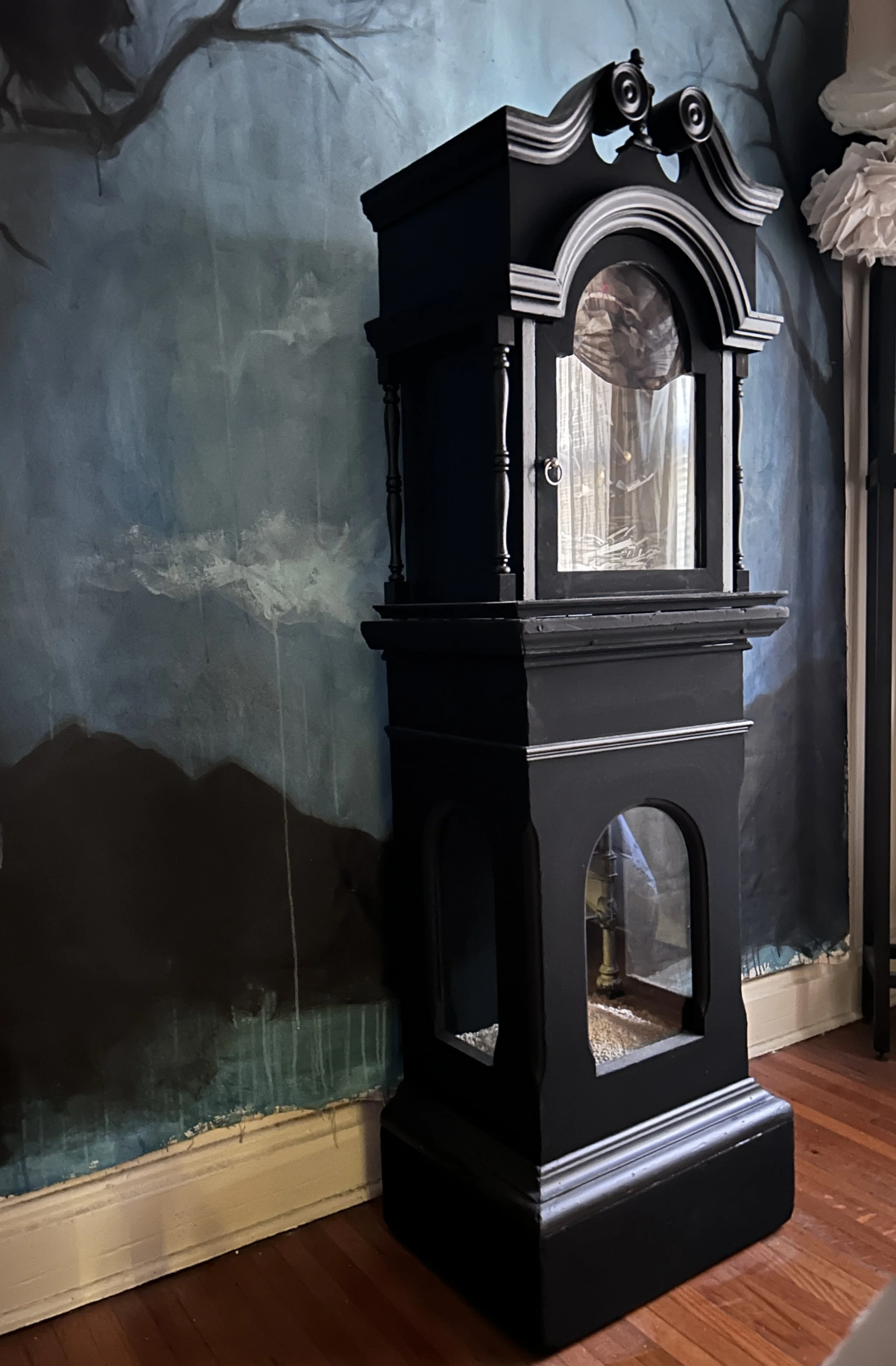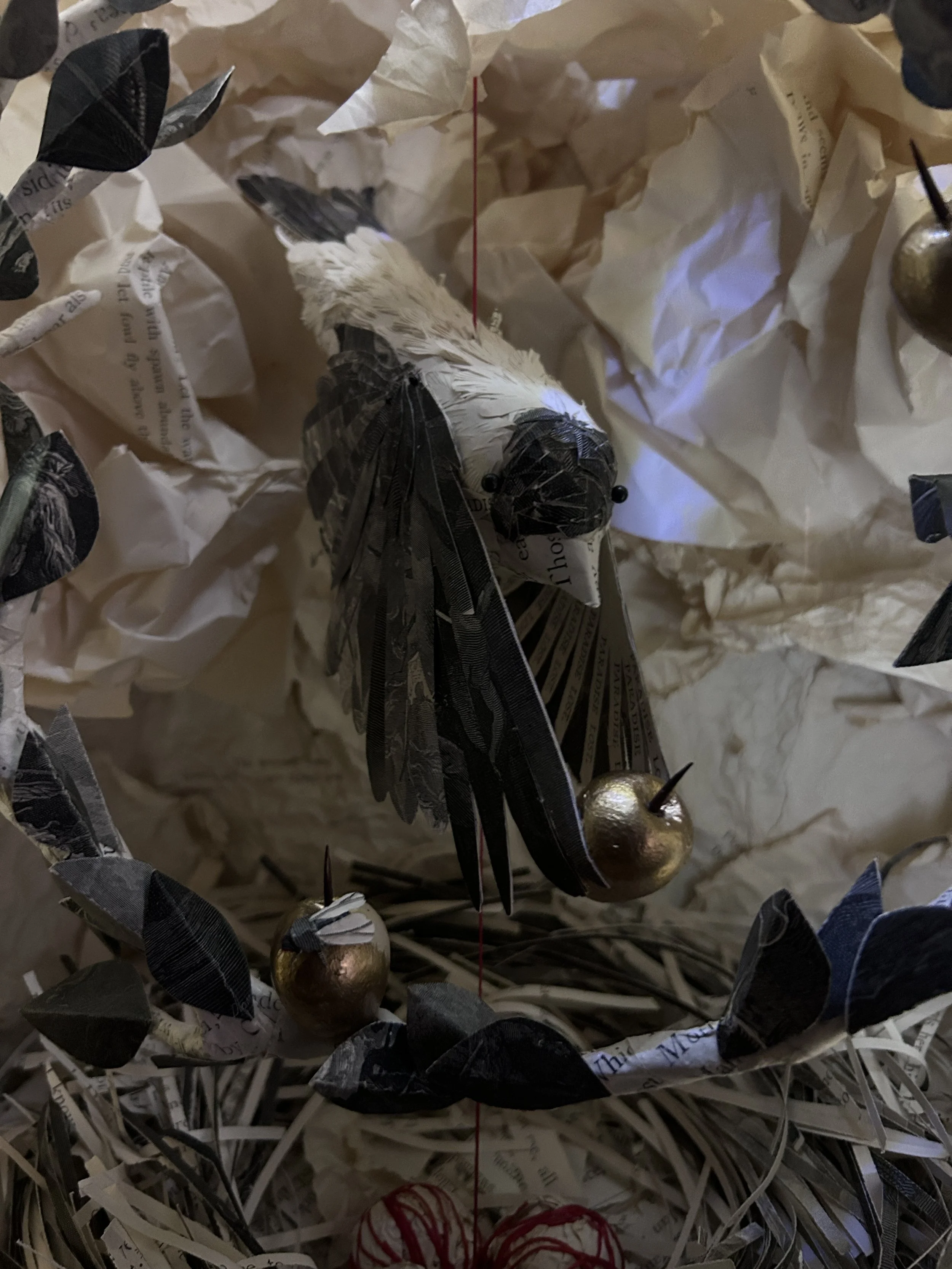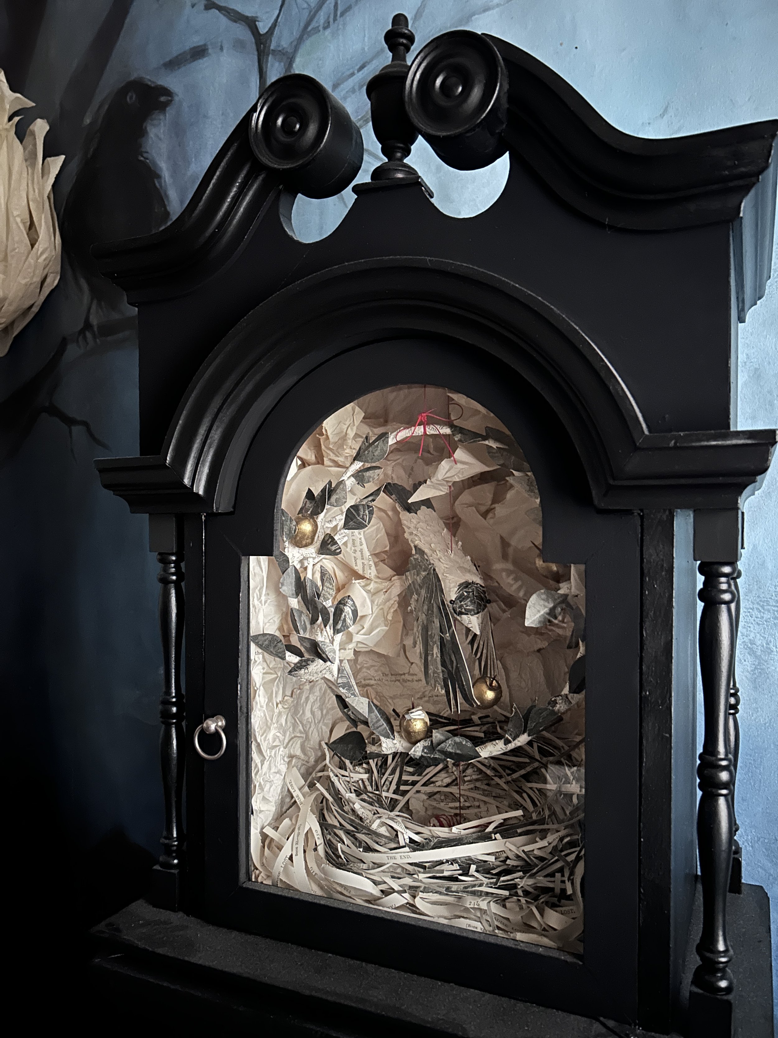 Made from the pages of the 1866 edition of Milton’s epic poem, illustrated by Gustave Doré. Refurbished antique grandfather clock case and staircase newel, wire, clay, trinitite, waxed string, led lights