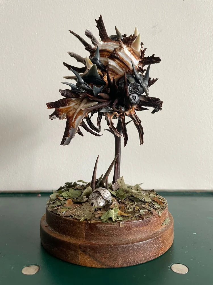 Private coiled photo, Murex Endiva Long Spine, fossilized shark teeth (<10,000 yrs), young shark teeth, honey locust thorns, cowbird eggshell, crushed dried leaves from every hand-planted tree in my fathers yard.