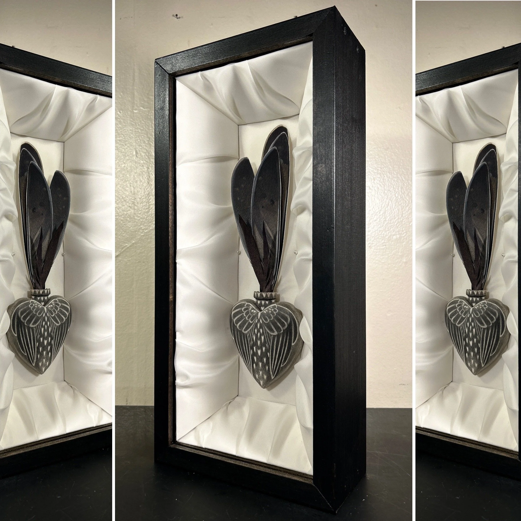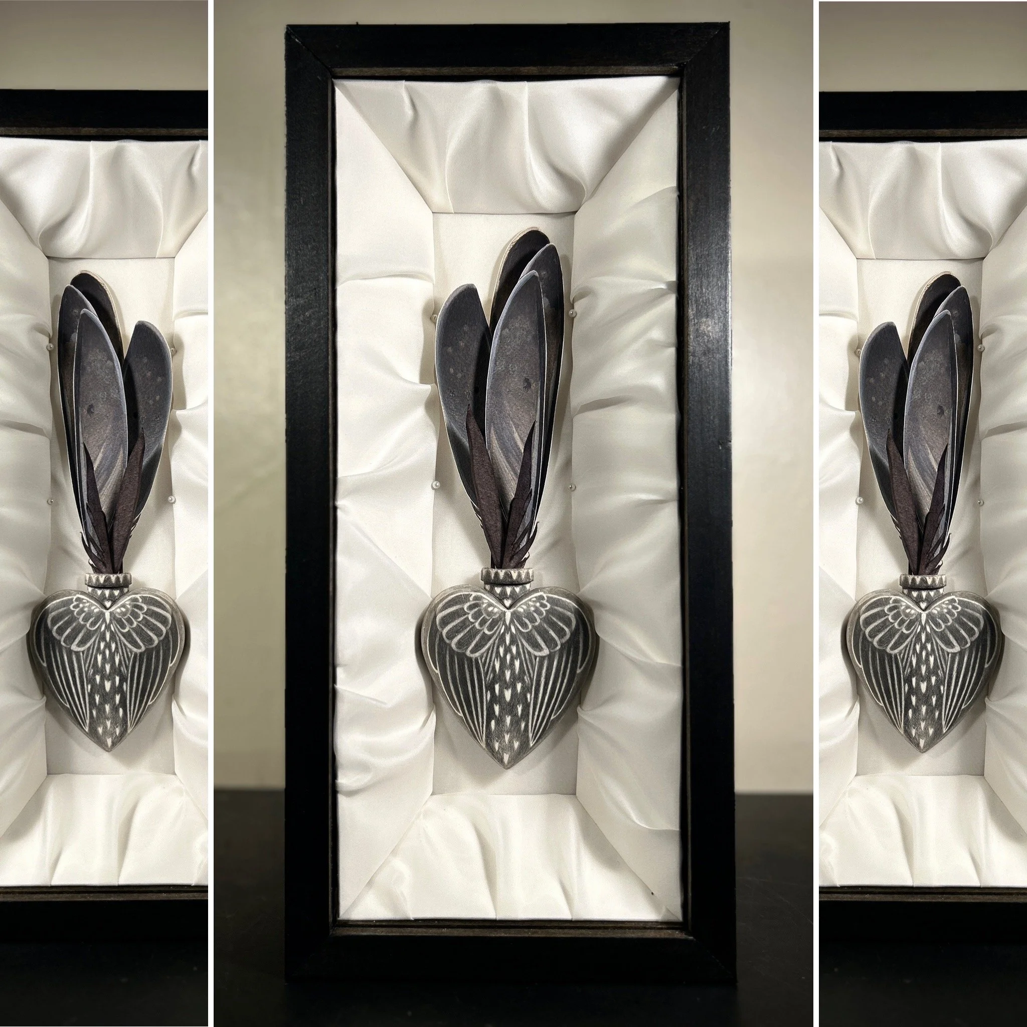 Handmade sacred heart of clay, female European Starling feather patterns in graphite, painted starling feathers on watercolor paper, chiffon, handmade frame.