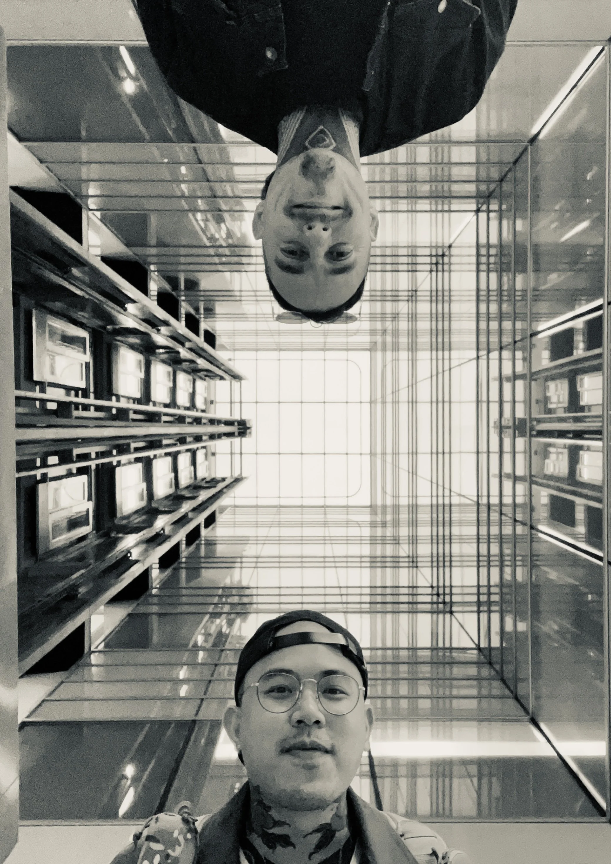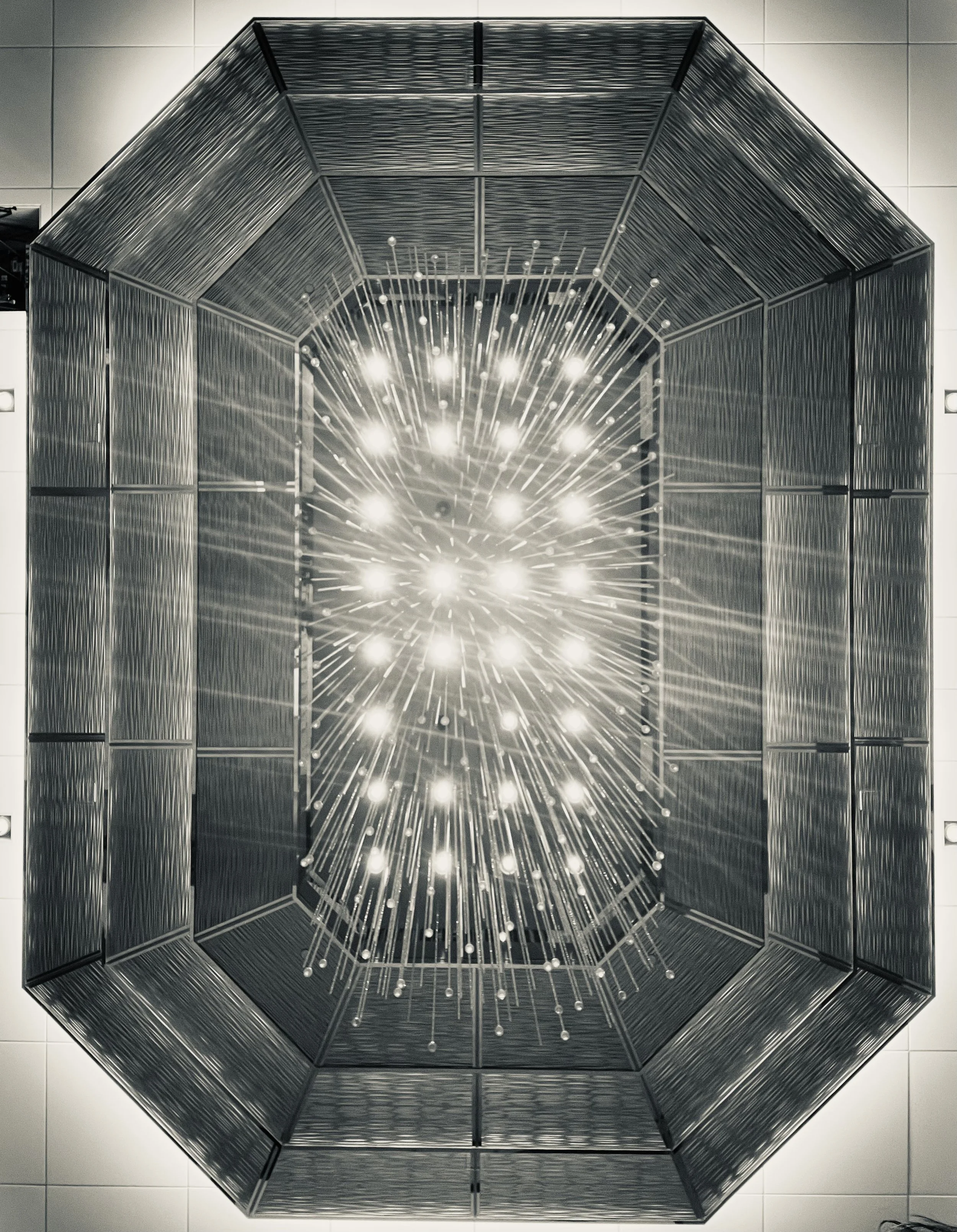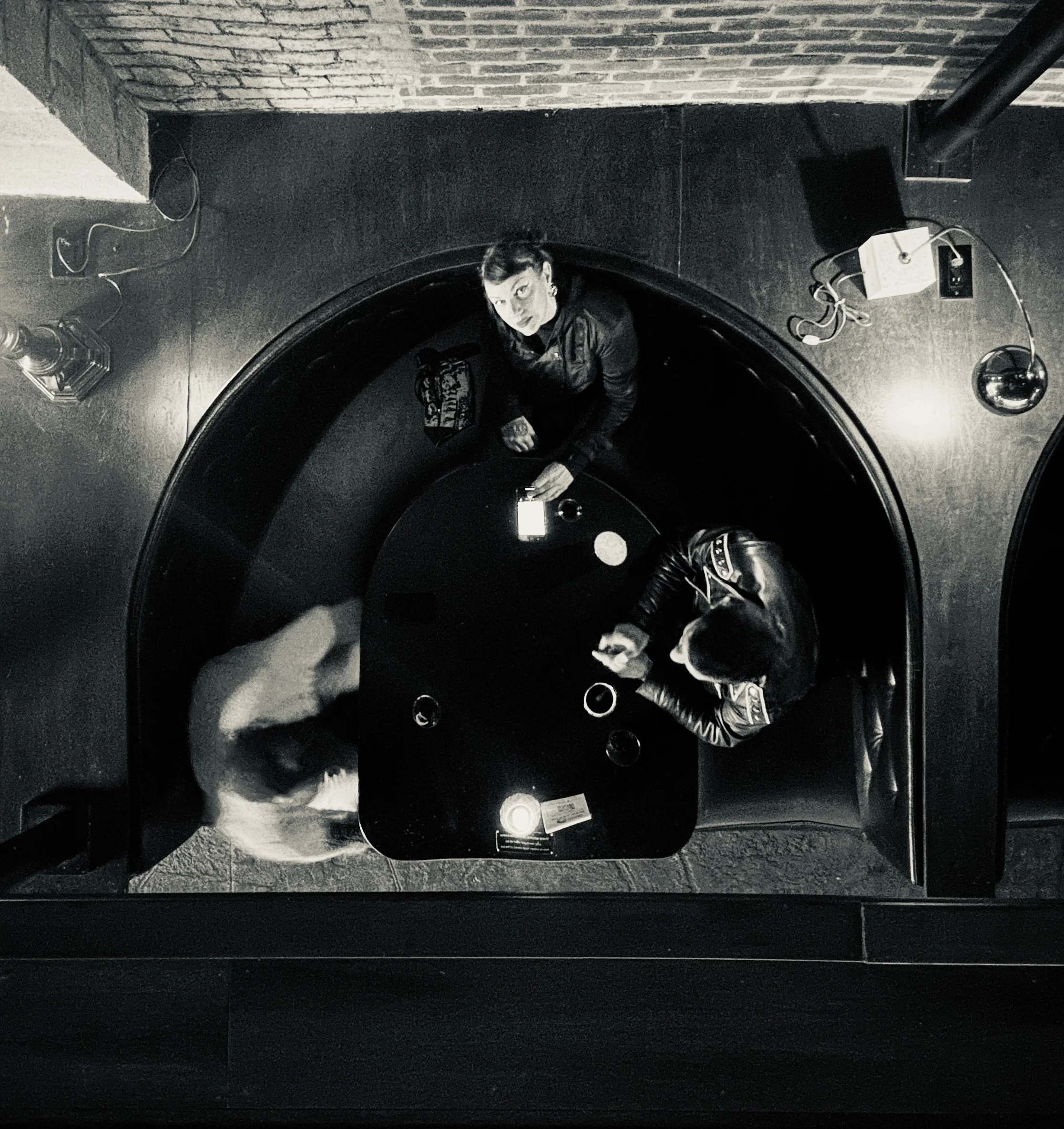 Naza and Ian in elevator shaft at L'Antiga Esquerra de''Eixample; Barcelona, Spain 2022